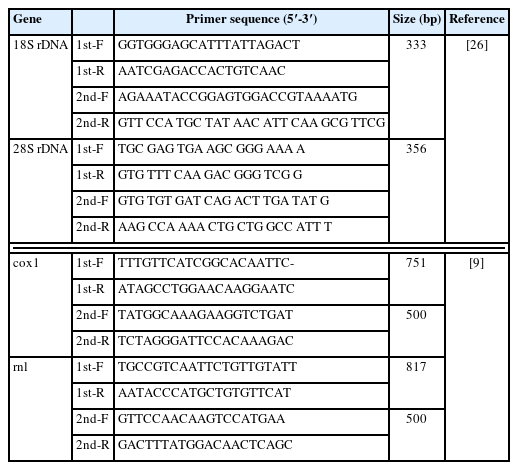 Kudoa Real-time PCR kit (KogeneBiotech, Seoul, Korea). After obtaining specific fluorescence amplification curves, nested PCR was performed to detect the 18S and 28S ribosomal DNAs. Primers of 2