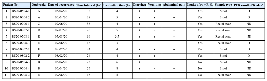 Table 3Summary of epidemiological characteristics for 11 food poisoning patients related to seafood intake in Busan