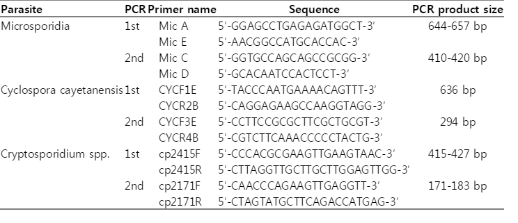 0 were spiked into 500 µg of uninfected human stool and mixed with 10 ml distilled water (DW). After washing with DW twice by centrifugation at 100 g, pellets were resuspended in ASL lysis buffer included in the kit. The samples were incubated at 70℃ for 30 min. The procedure was executed in accordance with the manufacturer's recommendations. The extracted DNA was used as a template for PCR. DNA of