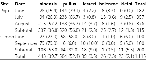 Site Date sinensis pullus lesteri belenrae kleini Total Paju June 28 (15.4) 144 (79.1) 4 (2.2) 6 (3.3) 0 (0.0) 182 July 94 (26.3) 238 (66.7) 3 (0.8) 13 (3.6) 9 (2.5) 357 August 215 (57.2) 138 (36.7) 14 (3.7) 6 (1.6) 3 (0.8) 376 Subtotal 337 (36.8) 520 (56.8) 21 (2.3) 25 (2.7) 12 (1.3) 915 Gimpo June 27 (27.0) 58 (58.0) 8 (8.0) 1 (1.0) 6 (6.0) 100 September 79 (79.0) 6 (6.0) 10 (10.0) 0 (0.0) 5 (5.0) 100 Subtotal 106 (53.0) 64 (32.0) 18 (9.0) 1 (0.5) 11 (5.5) 200 Total 443 (39.7) 584 (52.4) 39 (3.5) 26 (2.3) 23 (2.1) 1,115
