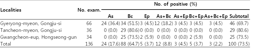 Table 1.Prevalence of intestinal parasites infection in pigs examined by the direct smear method and the centrifugal sedimentation method in Chungcheongnam-do, Korea