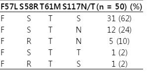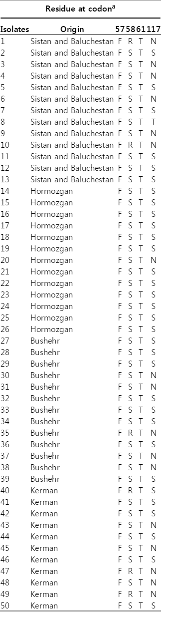 Isolates Origin 57 58 61 117 1 Sistan and Baluchestan F R T N 2 Sistan and Baluchestan F S T S 3 Sistan and Baluchestan F S T N 4 Sistan and Baluchestan F S T N 5 Sistan and Baluchestan F S T S 6 Sistan and Baluchestan F S T N 7 Sistan and Baluchestan F S T S 8 Sistan and Baluchestan F S T T 9 Sistan and Baluchestan F S T N 10 Sistan and Baluchestan F R T N 11 Sistan and Baluchestan F S T S 12 Sistan and Baluchestan F S T S 13 Sistan and Baluchestan F S T S 14 Hormozgan F S T S 15 Hormozgan F S T S 16 Hormozgan F S T S 17 Hormozgan F S T S 18 Hormozgan F S T S 19 Hormozgan F S T S 20 Hormozgan F S T N 21 Hormozgan F S T S 22 Hormozgan F S T S 23 Hormozgan F S T S 24 Hormozgan F S T S 25 Hormozgan F S T S 26 Hormozgan F S T S 27 Bushehr F S T S 28 Bushehr F S T S 29 Bushehr F S T S 30 Bushehr F S T N 31 Bushehr F S T N 32 Bushehr F S T S 33 Bushehr F S T S 34 Bushehr F S T S 35 Bushehr F R T N 36 Bushehr F S T S 37 Bushehr F S T N 38 Bushehr F S T N 39 Bushehr F S T S 40 Kerman F R T S 41 Kerman F S T S 42 Kerman F S T S 43 Kerman F S T N 44 Kerman F S T S 45 Kerman F S T N 46 Kerman F S T S 47 Kerman F R T N 48 Kerman F S T N 49 Kerman F R T N 50 Kerman F S T S F57L S58R T61M S117N/T (n = 50) (%) F S T S 31 (62) F S T N 12 (24) F R T N 5 (10) F S T T 1 (2) F R T S 1 (2)