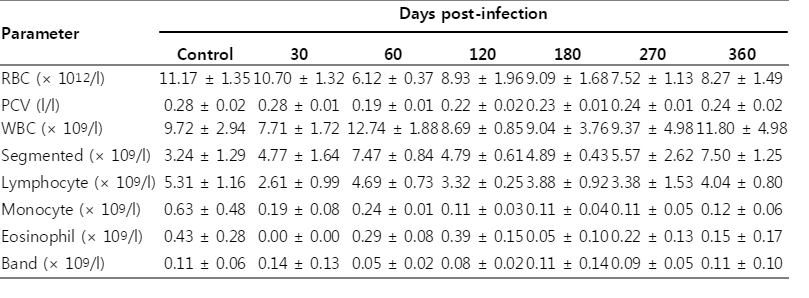 19]. In the present study, infected goats exhibited decrease of albumin and showed marked increases of serum globulin and total protein concentrations from 30 days after inoculation to day 360 PI. Globulin as a chronic phase protein increases in chronic diseases [