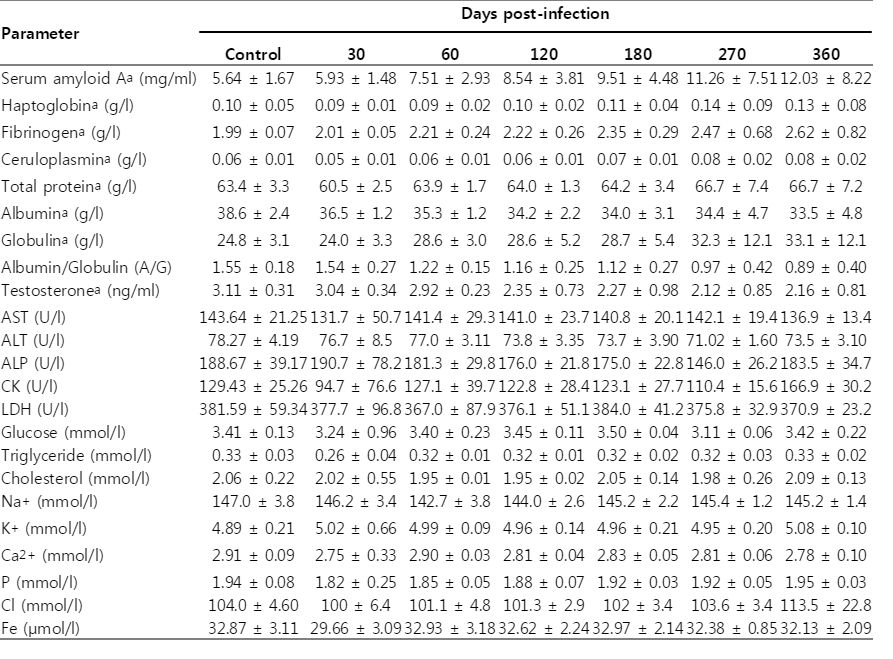 2, respectively. However, there were variations in hematological analyses; the differences were not statistically significant with those of the normal values. From day 30 to day 360 PI, statistically results showed that the acute phase proteins concentrations, including SAA, Hp, fibrinogen, and ceruloplasmin, increased, whereas testosterone concentrations decreased. Serum total protein concentrations increased. Infected goats exhibited decrease of albumin and increase of globulin concentrations. These parameters were statistically significant (
