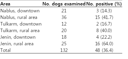 Table 1.The infection rate of Toxocara canis in dogs, from 3 cities of North West Bank of Palestine from September 2008 to April 2009