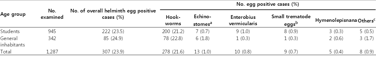 E. vermicularis (1.0% vs 0.3%) and small trematode egg positive rates (0.9% vs 0.3%) and slightly lower rates in echinostome egg positive rate (0.7% vs 1.8%) than general inhabitants. Echinostome egg positive cases, 13 in total number, consisted of 8 males and 5 females, and 6 students and 7 inhabitants. Some of them suffered from occasional gastrointestinal discomfort, indigestion, and diarrhea.