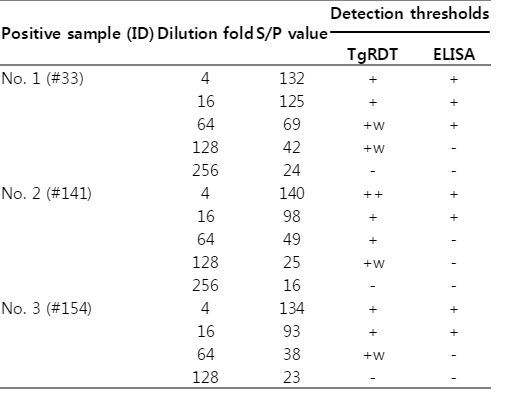 To investigate the analytical sensitivity of TgRDT, we used 3 different positive specimens. The sera from cats were serially diluted with negatives ranging from 1 to 128 folds and then they were used to the testing. The detection threshold level of the kit was compared with the commercial ELISA kit, ID Screen® Toxoplasmosis Indirect, which has been used popularly in Korea. The S/P values were calculated by the following formula according to the direction of the kit insert.