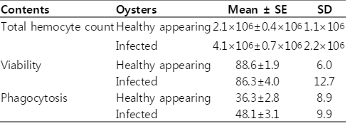 Fig. 4). The hemocyte viability was 88.6±1.9% (SD; 6.0) in HAO and 86.3±4.0% (SD; 12.7) in the oysters infected with