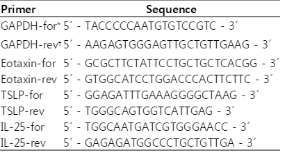 5 CT-26 cells were collected in 1 ml of QIAzol (Qiagen science, Valencia, California, USA), and RNA extraction was conducted in accordance with the manufacturer's protocols, transcribing 2 µg of RNA using moloney murine leukemia virus (M-MLV) reverse transcriptase (Promega, Madison, Wisconsin, USA). The Eotaxin, TSLP, IL-25 RNA levels were determined by real-time PCR using iCycler™ (Bio-Rad Laboratories, Inc., Hercules, California, USA) real-time PCR machines. GAPDH was utilized as the reference gene. The primer sequences are provided in