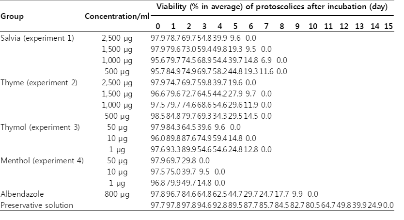 Stock solutions of alcoholic crude extracts of salvia, thyme, thymol, and menthol were prepared by dissolving 2.5 g of the dried extract or pure compound in 10 ml distilled water (25 mg/ml). Adding a few drops to 5 ml Tween 80 (2%) helped dissolving the dried extract or pure compound. Concentrations of 500, 1,000, 1,500, and 2,500 µg/ml of stock solutions for salvia (experiment 1) and thyme (experiment 2) were used. Concentrations of 1, 10, and 50 µg/ml of the stock solutions for thymol (experiment 3) and menthol (experiment 4) were used. The efficacy of alcoholic extracts of both plants on the viability of protoscolices was compared with that of albendazole sulfoxide (ABZSO) 800 µg/ml (experiment 5), the recommended drug for treating hydatidosis [