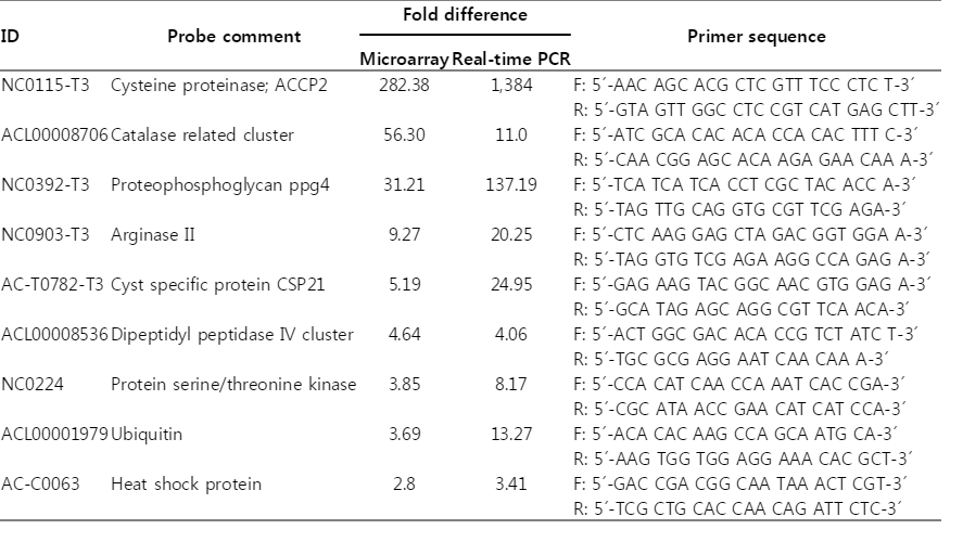 Table 3 shows the list of genes highly expressed more than 10-folds in the cyst than in the trophozoite. As many as 66 genes were highly expressed more than 10-folds in cysts. Especially, cysteine proteinases showed significantly high expression changes, 282 folds in cysts. Real-time PCR also showed high expression levels of cysteine proteinases. On the other hand, among these genes, 22 genes were not identified and 42 genes were not annotated (#N/A). These unidentified or non-annotated genes are needed to be investigated more about functional roles in encystation of