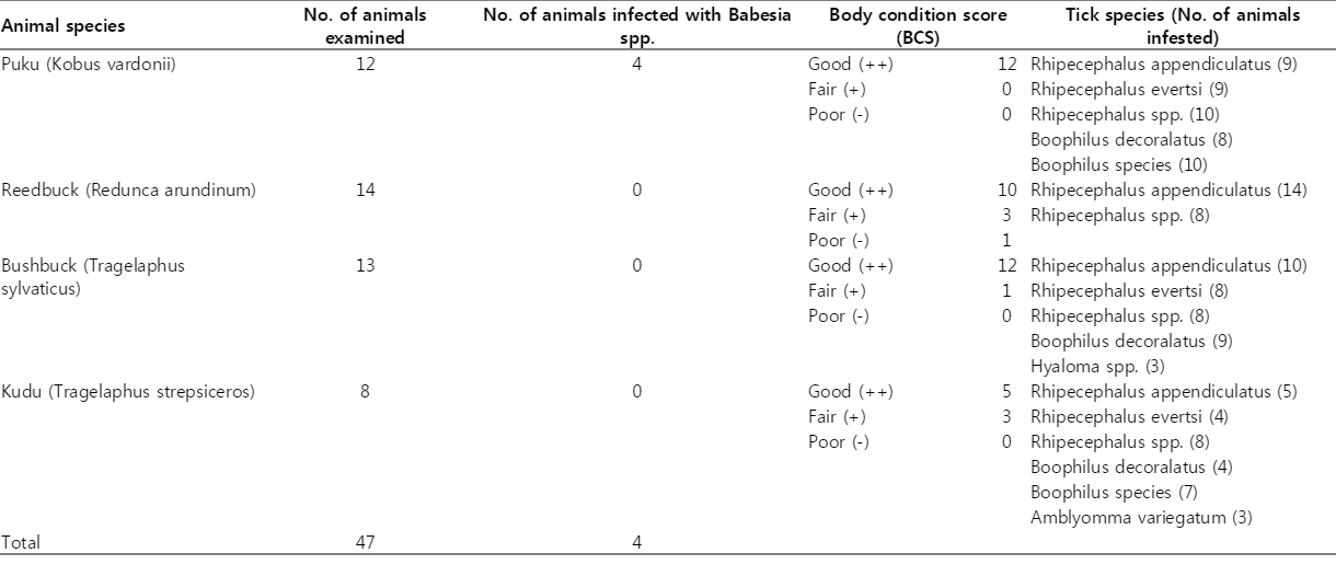 Animal species No. of animals examined No. of animals infected with Babesia spp. Body condition score (BCS) Tick species (No. of animals infested) Puku (Kobus vardonii) 12 4 Good (++) 12 Rhipecephalus appendiculatus (9) Fair (+) 0 Rhipecephalus evertsi (9) Poor (-) 0 Rhipecephalus spp. (10) Boophilus decoralatus (8) Boophilus species (10) Reedbuck (Redunca arundinum) 14 0 Good (++) 10 Rhipecephalus appendiculatus (14) Fair (+) 3 Rhipecephalus spp. (8) Poor (-) 1 Bushbuck (Tragelaphus sylvaticus) 13 0 Good (++) 12 Rhipecephalus appendiculatus (10) Fair (+) 1 Rhipecephalus evertsi (8) Poor (-) 0 Rhipecephalus spp. (8) Boophilus decoralatus (9) Hyaloma spp. (3) Kudu (Tragelaphus strepsiceros) 8 0 Good (++) 5 Rhipecephalus appendiculatus (5) Fair (+) 3 Rhipecephalus evertsi (4) Poor (-) 0 Rhipecephalus spp. (8) Boophilus decoralatus (4) Boophilus species (7) Amblyomma variegatum (3) Total 47 4