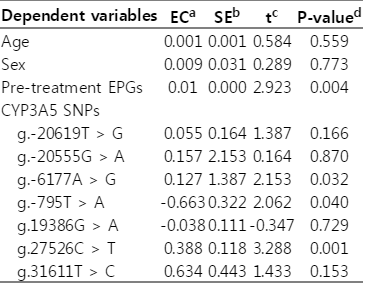 Key words: Clonorchis sinensis, clonorchiasis, praziquantel, cyochrome P450, CYP3A5, single nucleotide polymorphism (SNP), EPG