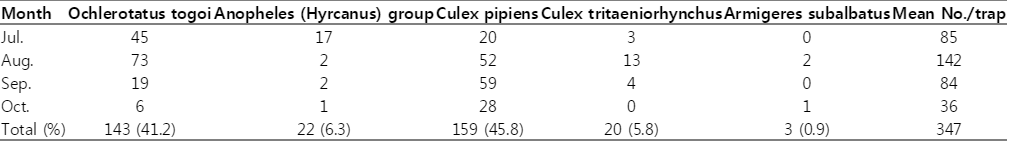 Oc. togoi peaked in August, then decreased markedly thereafter. There were a trap mean of 359.0 mosquitoes from 5 genera and 7 species collected from Sim-ri (