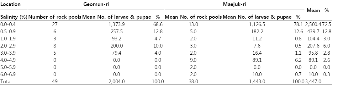 Table 10.Frequency distribution of salinity of Ochlerotatus togoi larvae and pupae at Geomun-ri (latitude 34˚17´N, longitude 127˚23´E), Geomun Island, Yeosu-si, Jeollanam-do, and Maejuk-ri (latitude 34˚38´N, longitude 128˚34´E), Maemul Island, Tongyeong-si, Gyeongsangnam-do in 2004