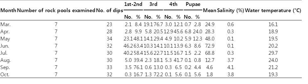 At Wimi-ri, the number of Oc. togoi (14.7) was the highest in April. Unlike the previous 2 sites, larvae were comprised mostly of 1st and 2nd instars (70.7%). The sampling schedule was disrupted at times due to frequent periods of drought, which resulted in some of the rock pools drying.