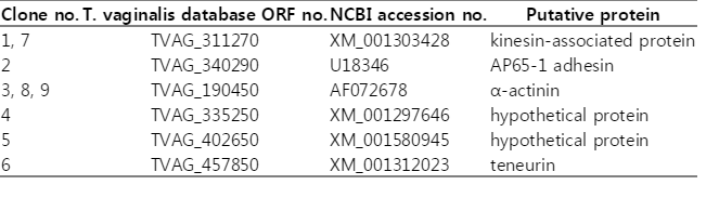 Table 1.Proteins identified by immunoscreening of T. vaginalis cDNA library using anti-T. vaginalis antibodies