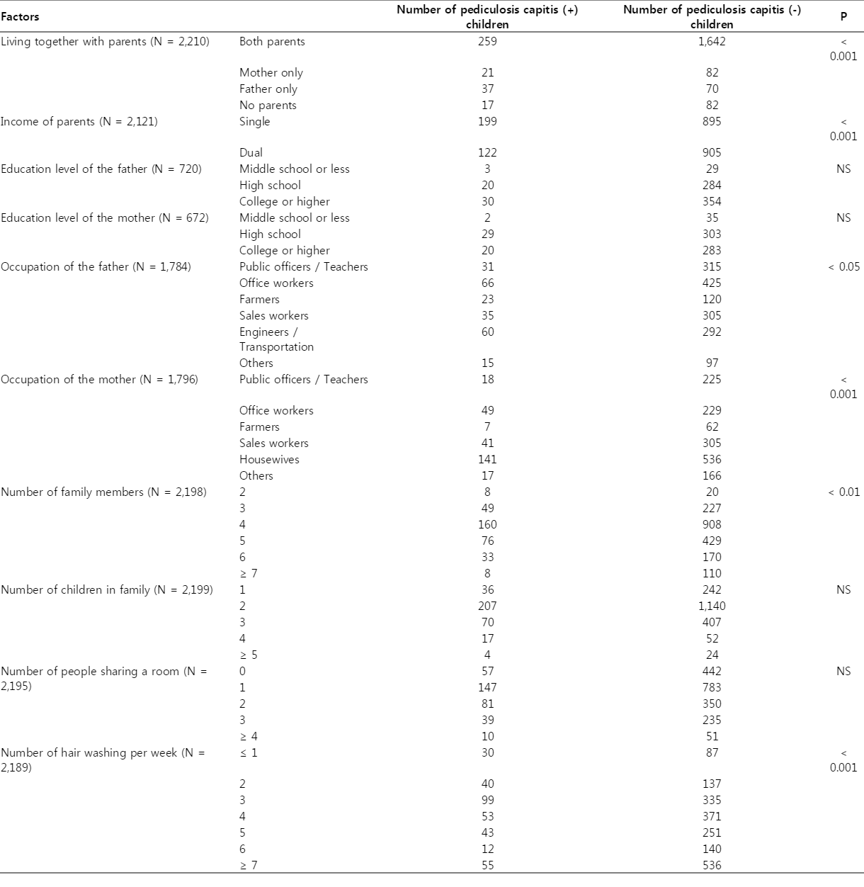 The present study was carried out from September to December 2007 in 17 primary schools throughout the country. Six schools were in urban areas; 1 each in Seoul, Busan, Daejeon, Gyeonggi-do, Chungcheongnam-do, and Jeollabuk-do, and 11 schools in rural areas: 1 in Gyeonggi-do, 5 in Chungcheongbuk-do, 3 in Chungcheongnam-do, 1 in Jeollanam-do, and 1 in Gyeongsangnam-do. For the diagnosis of HLI, students were examined carefully by visual inspection of the scalp and hair for the presence of adult lice, nymphs, or viable nits. Nits which were within 1 cm from the scalp and plump, shiny and tan to coffee-colored with an intact operculum were considered viable. The students were subjected to questionnaire and data were obtained from the questionnaire. This included several questions on living together with parents, source of family income, parents' education levels and occupation, the number of family members and number of children in a family, the number of people sharing a room, and the number of hair washing per week. A total of 334 questionnaires were obtained from children with HLI and 1,876 questionnaires from children without HLI. Incomplete answers were excluded from the data. Statistical analysis was performed using chi-square test and the Student's t-test. P-values of <0.05 were considered significant.