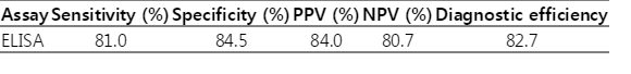 Table 2 gives determination of the sensitivity, specificity, PPV, NPV provided, and the diagnostic efficiency of anti-PvAMA-1 antibody using indirect ELISA.
