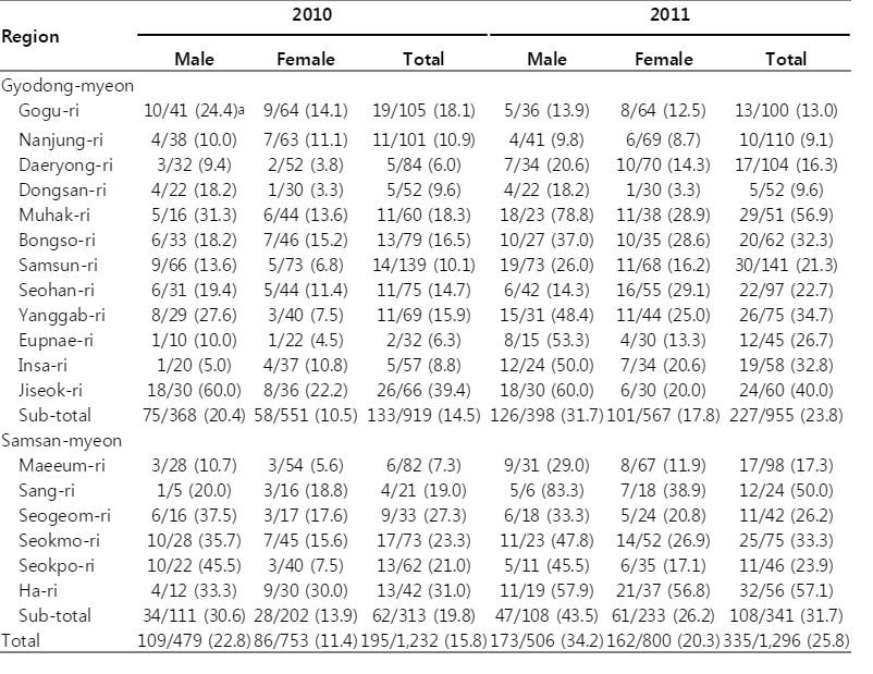 Table 1). The positive rate of males was always higher than that of females in both myeons; however, the ratio of positive rates for males to females was lowered such that the ratio in Gyodong-myeon changed from 1.94 to 1.78 and from 2.20 to 1.66 in Samsan-myeon during the 2 years. There was no regional tropism of the increase in the positive rates within the islands. Regionally, the positive rates at Gogu-ri, Nanjung-ri, Dongsan-ri, and Jiseok-ri of Gyodong-myeon were maintained for 2 years regardless of the positive rates in 2010, while those of the other villages showed more rigorous increases in the positive rates. This was also observed in the villages of Samsan-myeon except for Seokpo-ri and Seogeom-ri.