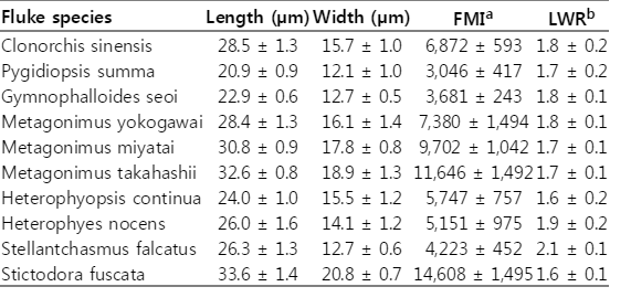 Table 1.Measurements of the eggs of minute intestinal flukes and C. sinensis that occur in the Republic of Korea