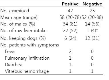 Table 1). While 22 of these 42 seropositive patients (52.3%) had a recent history of consuming raw livers, only 1 of 25 seronegative patients (4%) had such a history. This difference was proved to be statistically significant (