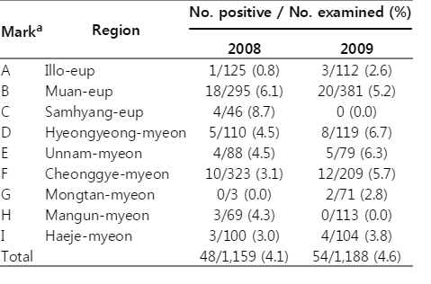 Table 1.Number of egg-positive children in 2008 and 2009 in 9 regions of Muan-gun, Jeollanam-do, Korea