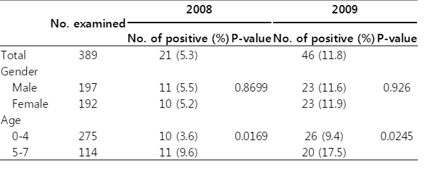 Table 3.Egg positive rate of Enterobius vermicularis by sex and age in children examined in both 2008 and 2009