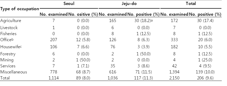 3). With regard to occupation, the 18.2% seropositive rate among Jeju-do residents who engaged in agriculture was markedly higher than the average value of 11.3%, although there was no statistical significance (