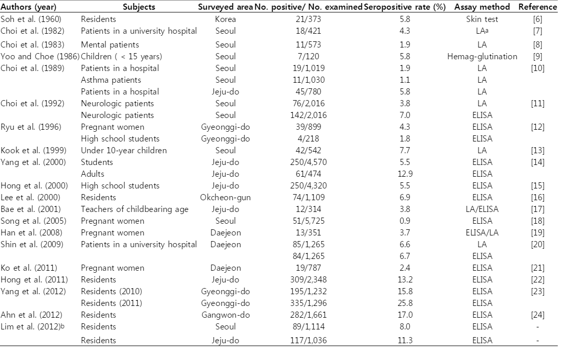 In the Republic of Korea (hereafter referred to as Korea), the seroprevalence of toxoplasmosis has been studied by many researchers [