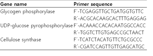 8]. Real-time PCR analysis was performed to compare the expression levels of 3 enzymes involved in glycogen degradation and cellulose synthesis. Three sets of primers were used (