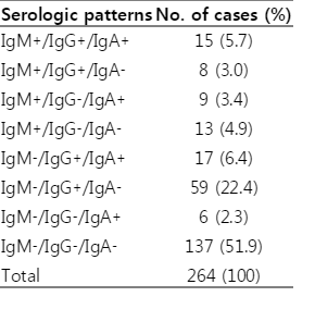 Serologic patterns No. of cases (%) IgM+/IgG+/IgA+ 15 (5.7) IgM+/IgG+/IgA- 8 (3.0) IgM+/IgG-/IgA+ 9 (3.4) IgM+/IgG-/IgA- 13 (4.9) IgM-/IgG+/IgA+ 17 (6.4) IgM-/IgG+/IgA- 59 (22.4) IgM-/IgG-/IgA+ 6 (2.3) IgM-/IgG-/IgA- 137 (51.9) Total 264 (100)