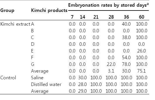 Table 1. Eggs incubated at 25℃ showed marked differences in larval development rate between the kimchi extract group and the control group: While some of the eggs in the control group showed larval development as early as day 14 (29.0%), similar degree of embryonation was only observed by day 36 in the kimchi extract group (30.0%,