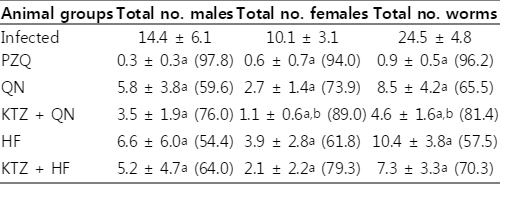 Table 1. Effects of QN or HF alone and in addition to KTZ on the number of male and female worms in S. mansoni-infected mice at week 9 post-infection (i.e., week 2 post-treatment)