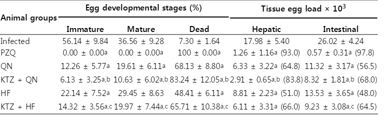 Animal groups Total no. males Total no. females Total no. worms Infected 14.4 ± 6.1 10.1 ± 3.1 24.5 ± 4.8 PZQ 0.3 ± 0.3a (97.8) 0.6 ± 0.7a (94.0) 0.9 ± 0.5a (96.2) QN 5.8 ± 3.8a (59.6) 2.7 ± 1.4a (73.9) 8.5 ± 4.2a (65.5) KTZ + QN 3.5 ± 1.9a (76.0) 1.1 ± 0.6a,b (89.0) 4.6 ± 1.6a,b (81.4) HF 6.6 ± 6.0a (54.4) 3.9 ± 2.8a (61.8) 10.4 ± 3.8a (57.5) KTZ + HF 5.2 ± 4.7a (64.0) 2.1 ± 2.2a (79.3) 7.3 ± 3.3a (70.3) Animal groups Egg developmental stages (%)