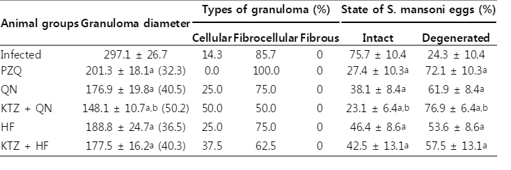Immature Mature Dead Hepatic Intestinal Infected 56.14 ± 9.84 36.56 ± 9.28 7.30 ± 1.64 17.98 ± 5.40 26.02 ± 4.24 PZQ 0.00 ± 0.00a 0.00 ± 0.00a 100 ± 0.00a 1.26 ± 1.16a (93.0) 0.57 ± 0.31a (97.8) QN 12.26 ± 5.77a 19.61 ± 6.11a 68.13 ± 8.80a 6.33 ± 3.22a (64.8) 11.32 ± 3.17a (56.5) KTZ + QN 6.13 ± 3.25a,b 10.63 ± 6.02a,b 83.24 ± 12.05a,b 2.91 ± 0.65a,b (83.8) 8.32 ± 1.81a,b (68.0) HF 22.14 ± 7.52a 29.45 ± 8.63 48.41 ± 6.11a 8.81 ± 2.23a (51.0) 13.53 ± 3.65a (48.0) KTZ + HF 14.32 ± 3.56a,c 19.97 ± 7.44a,c 65.71 ± 10.38a,c 6.11 ± 3.31a (66.0) 9.23 ± 3.08a,c (64.5) Animal groups Granuloma diameter Types of granuloma (%)