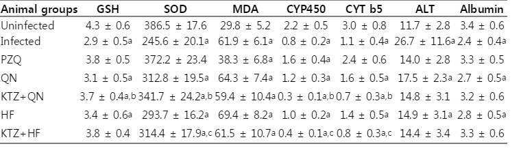 Table 4. Effect of QN or HF alone and in addition to KTZ on liver antioxidant capacity, CYP450 and CYT b5 activities and hepatic function in S. mansoni-infected mice 9 weeks post-infection (i.e., 2 weeks post treatment)