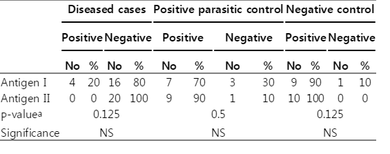 No % No % No % No % No % No % Antigen I 4 20 16 80 7 70 3 30 9 90 1 10 Antigen II 0 0 20 100 9 90 1 10 10 100 0 0 P-valuea 0.125 0.5 0.125 Significance NS NS NS Diseased cases