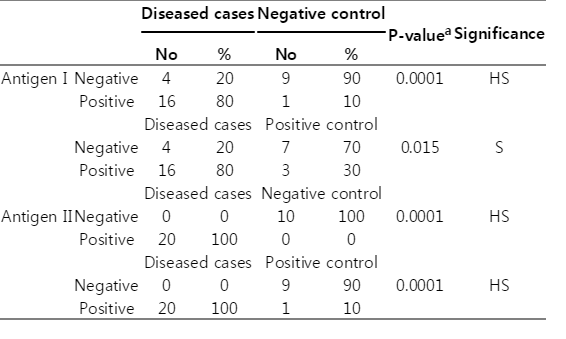 P-valuea Significance No % No % Antigen I Negative 4 20 9 90 0.0001 HS Positive 16 80 1 10 Diseased cases Positive control Negative 4 20 7 70 0.015 S Positive 16 80 3 30 Diseased cases Negative control Antigen II Negative 0 0 10 100 0.0001 HS Positive 20 100 0 0 Diseased cases Positive control Negative 0 0 9 90 0.0001 HS Positive 20 100 1 10