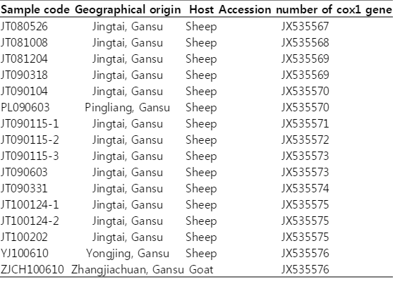 T. multiceps larval stage were obtained from naturally infected sheep or goats in Gansu Province which is situated in the northwestern part of China between the northern latitudes of 32° to 40° and eastern longitudes of 94° to 108°. Sample code, geographical origin, and host are shown in detail in