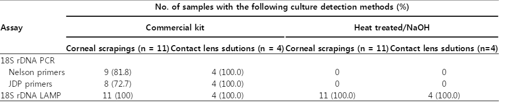 Table 3.Detection of Acanthamoeba by the conventional PCR and LAMP assay using 2 differently prepared samples