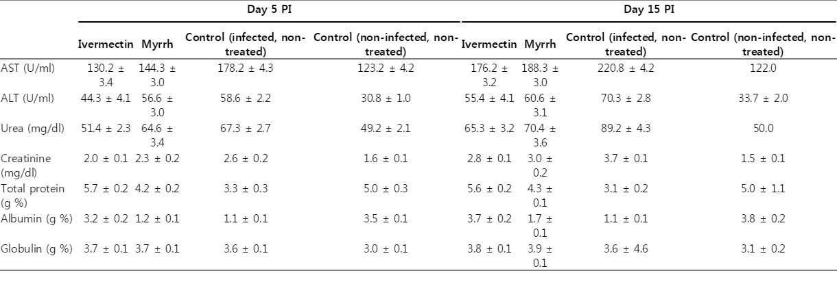 Ivermectin Myrrh Control (infected, non-treated) Control (non-infected, non-treated) Ivermectin Myrrh Control (infected, non-treated) Control (non-infected, non-treated) AST (U/ml) 130.2 ± 3.4 144.3 ± 3.0 178.2 ± 4.3 123.2 ± 4.2 176.2 ± 3.2 188.3 ± 3.0 220.8 ± 4.2 122.0 ALT (U/ml) 44.3 ± 4.1 56.6 ± 3.0 58.6 ± 2.2 30.8 ± 1.0 55.4 ± 4.1 60.6 ± 3.1 70.3 ± 2.8 33.7 ± 2.0 Urea (mg/dl) 51.4 ± 2.3 64.6 ± 3.4 67.3 ± 2.7 49.2 ± 2.1 65.3 ± 3.2 70.4 ± 3.6 89.2 ± 4.3 50.0 Creatinine (mg/dl) 2.0 ± 0.1 2.3 ± 0.2 2.6 ± 0.2 1.6 ± 0.1 2.8 ± 0.1 3.0 ± 0.2 3.7 ± 0.1 1.5 ± 0.1 Total protein (g %) 5.7 ± 0.2 4.2 ± 0.2 3.3 ± 0.3 5.0 ± 0.3 5.6 ± 0.2 4.3 ± 0.1 3.1 ± 0.2 5.0 ± 1.1 Albumin (g %) 3.2 ± 0.2 1.2 ± 0.1 1.1 ± 0.1 3.5 ± 0.1 3.7 ± 0.2 1.7 ± 0.1 1.1 ± 0.1 3.8 ± 0.2 Globulin (g %) 3.7 ± 0.1 3.7 ± 0.1 3.6 ± 0.1 3.0 ± 0.1 3.8 ± 0.1 3.9 ± 0.1 3.6 ± 4.6 3.1 ± 0.2 Serum parameters Ivermectin Myrrh Control (infected non-treated) Control (non-infected non-treated) AST (μ/ml) 199.2 ± 355.0 198.4 ± 3.0 201.9 ± 6.2 124.2 ± 3.0 ALT (μ/ml) 71.3 ± 4.1 72.6 ± 3.1 72.3 ± 2.8 33.8 ± 1.1 Urea (mg/dl) 80.1 ± 2.3 83.5 ± 3.4 83.2 ± 4.2 51.1 ± 2.1 Creatinine (mg/dl) 2.9 ± 0.1 2.9 ± 0.2 3.0 ± 0.2 1.8 ± 0.1 Total proteins (g %) 2.8 ± 0.2 2.8 ± 0.2 2.8 ± 0.2 5.4 ± 0.2 Albumin (g %) 1.1 ± 0.2 1.1 ± 0.1 1.1 ± 0.1 3.2 ± 0.2 Globulins (g %) 4.0 ± 0.1 4.0 ± 0.1 4.0 ± 0.1 2.6 ± 0.1