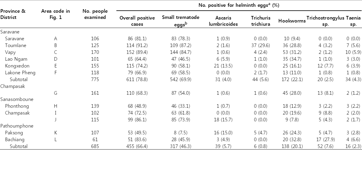 Overall positive cases Small trematode eggsb Ascaris lumbricoides Trichuris trichiura Hookworms Trichostrongylus sp. Taenia sp. Saravane  Saravane A 106 86 (81.1) 83 (78.3) 1 (0.9) 0 (0.0) 10 (9.4) 0 (0.0) 0 (0.0)  Toumlane B 125 114 (91.2) 109 (87.2) 2 (1.6) 37 (29.6) 36 (28.8) 4 (3.2) 7 (5.6)  Vapy C 170 152 (89.4) 144 (84.7) 1 (0.6) 4 (2.4) 53 (31.2) 2 (1.2) 10 (5.9)  Lao Ngam D 101 65 (64.4) 47 (46.5) 6 (5.9) 1 (1.0) 35 (34.7) 1 (1.0) 3 (3.0)  Kongxedon E 155 115 (74.2) 90 (58.1) 21 (13.5) 0 (0.0) 25 (16.1) 12 (7.7) 6 (3.9)  Lakone Pheng F 118 79 (66.9) 69 (58.5) 0 (0.0) 2 (1.7) 13 (11.0) 1 (0.8) 1 (0.8)   Subtotal 775 611 (78.8) 542 (69.9) 31 (4.0) 44 (5.6) 172 (22.1) 20 (2.5) 34 (4.3) Champasak  Sanasomboune G 161 110 (68.3) 87 (54.0) 1 (0.6) 1 (0.6) 45 (28.0) 13 (8.1) 2 (1.2)  Phonthong H 139 68 (48.9) 46 (33.1) 1 (0.7) 0 (0.0) 18 (12.9) 3 (2.2) 3 (2.2)  Champasak I 102 74 (72.5) 63 (61.8) 0 (0.0) 0 (0.0) 20 (19.6) 9 (8.8) 2 (2.0)  Pathoumphone J 115 99 (86.1) 85 (73.9) 18 (15.7) 0 (0.0) 9 (7.8) 5 (4.3) 2 (1.7)  Paksong K 107 53 (49.5) 8 (7.5) 16 (15.0) 5 (4.7) 26 (24.3) 5 (4.7) 3 (2.8)  Bachiang L 61 51 (83.6) 28 (45.9) 3 (4.9) 0 (0.0) 20 (32.8) 17 (27.9) 4 (6.6)   Subtotal 685 455 (66.4) 317 (46.3) 39 (5.7) 6 (0.8) 138 (20.1) 52 (7.6) 16 (2.3) Province (District) Age and sex of resident No. of fluke specimens collecteda