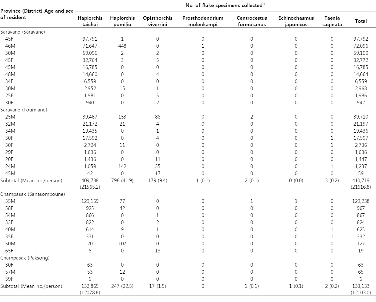 Haplorchis taichui Haplorchis pumilio Opisthorchis viverrini Prosthodendrium molenkampi Centrocestus formosanus Echinochasmus japonicus Taenia saginata Total Saravane (Saravane)  45F 97,791 1 0 0 0 0 0 97,792  46M 71,647 448 0 1 0 0 0 72,096  30M 59,096 2 2 0 0 0 0 59,100  45F 32,764 3 5 0 0 0 0 32,772  45M 16,785 0 0 0 0 0 0 16,785  48M 14,660 0 4 0 0 0 0 14,664  34F 6,559 0 0 0 0 0 0 6,559  30M 2,952 15 1 0 0 0 0 2,968  25F 1,981 0 5 0 0 0 0 1,986  30F 940 0 2 0 0 0 0 942 Saravane (Toumlane)  25M 39,467 153 88 0 2 0 0 39,710  32M 21,172 21 4 0 0 0 0 21,197  34M 19,435 0 1 0 0 0 0 19,436  30F 17,592 0 4 0 0 0 1 17,597  30F 2,724 11 0 0 0 0 1 2,736  29F 1,636 0 0 0 0 0 0 1,636  20F 1,436 0 11 0 0 0 0 1,447  24M 1,059 142 35 0 0 0 1 1,237  45M 42 0 17 0 0 0 0 59 Subtotal (Mean no./person) 409,738 (21565.2) 796 (41.9) 179 (9.4) 1 (0.1) 2 (0.1) 0 (0.0) 3 (0.2) 410,719 (21616.8) Champasak (Sanasomboune)  35M 129,159 77 0 0 1 1 0 129,238  58F 925 42 0 0 0 0 0 967  54M 866 0 1 0 0 0 0 867  33F 822 0 2 0 0 0 0 824  40M 614 9 1 0 0 0 1 625  35F 331 0 0 0 0 0 1 332  50M 20 107 0 0 0 0 0 127  65F 6 0 13 0 0 0 0 19 Champasak (Paksong)  30F 63 0 0 0 0 0 0 63  57M 53 12 0 0 0 0 0 65  39F 6 0 0 0 0 0 0 6 Subtotal (Mean no./person) 132,865 (12078.6) 247 (22.5) 17 (1.5) 0 1 (0.1) 1 (0.1) 2 (0.2) 133,133 (12103.0)