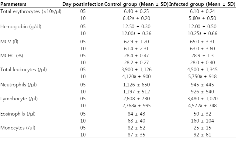 P<0.05) in the infected groups on day 10 PI, whereas total leukocytes and lymphocytes presented an increase in their levels when compared to the control group (