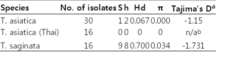 Table 2.Genetic diversity and neutrality values estimated from cox1 sequences of T. asiatica and T. saginata population