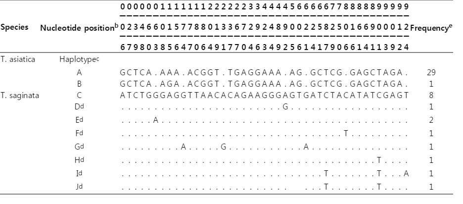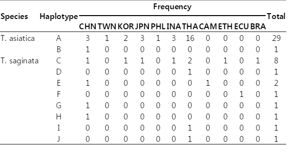 T. asiatica was haplotype A, composed of 29 samples. Only 1 sample from China was haplotype B, with only 1 polymorphic site found at nucleotide position 115 (