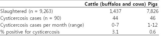 Cattle (buffalos and cows) Pigs Slaughtered (n = 9,263) 1,437 7,826 Cysticercosis cases (n = 90) 44 46 Cysticercosis cases per month (range) 0-7 1-12 % positive for cysticercosis 3.1 0.6