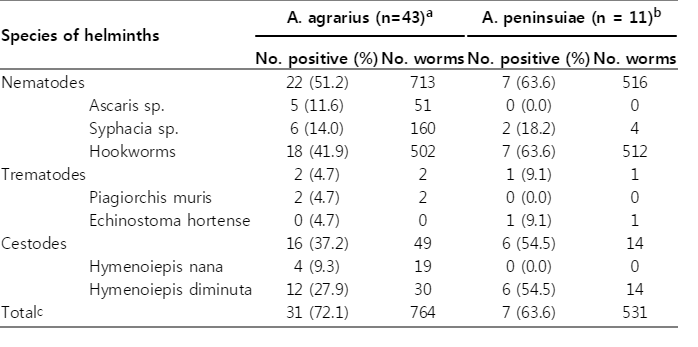 Infection rates of intestinal parasites in Apodemus agrarius and Apodemus peninsulae caught from 3 sites of Yanggu-gun and Inje-gun in northern Gangwon-do, Republic of Korea