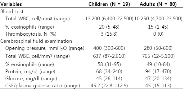 Table 2. Laboratory results of eosinophilic meningitis in children and adults